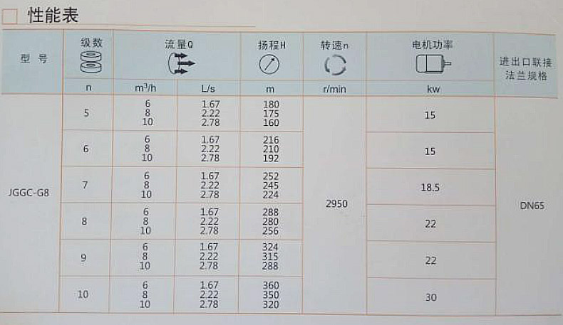 JGGC-G8![]() 【JGCC-G系列高扬程锅炉给水泵】 型号含义/Definition of Model JGGC-G8 - 35 ×8 JGGC------高效节能锅炉给水泵 G -------高扬程系列 8 ------流量 35 ------单级扬程 8 ------级数 【性能范围】 流量: Q=8~42m3/h 扬程: H=160~380m 电机转速:2950r/min 液体温度: -15℃~120℃ 电源: 一般情况下, 50HZ , 380V 【材质说明】 * 主要零部件如叶轮、轴套、泵轴用不锈钢制造 * 底座、电机座为铸铁件 * 采用硬质合金水润滑轴承及机械密封 * 采用刚性连联轴器传动 * 体积小、重量轻、抗腐蚀 * 振动小、噪音低、占地面积小、使用寿命长 * 高效节能、外形美观 【产品应用/Product application】 该系列水泵是一种多功能产品,可以输送从自来水到工业液体的各种不同介质,适用于不同温度,流量和压力范围。JGGC系列适用于无腐蚀性液体,JGGCN适用于轻度腐蚀性液体。广泛应用于锅炉配套给水系统、水处理系统、清洗喷淋系统、消防增压系统,还可用于热水循环、高层建筑供水、灌溉、空调冷却,化工等行业。 【运行条件/Operation condition】 ● 不含固体颗粒或纤维的液体。● 液体温度:常温型-15℃~+70℃ 热水型+70℃~+120℃● 环境温度:最高+40℃● 海拔:最高+1000m当泵在环境温度大于40℃或海拔高于1000m下运行时,由于空气密度低冷却效果差,电机输出功率会有一定降低。泵在上述情况下运行电机功率需配大。严禁水泵无水运转,检查确保不会/没有处于汽蚀状态。 【电机/Motor】 ●如用户不作要求,本厂提供水泵的电源要求均为380V、50HZ。但根据用户要求,可提供特殊频率(50HZ、60HZ)、特殊电压(110V~660V)的电源用泵,亦可配备防爆电机,防潮、防湿电机。